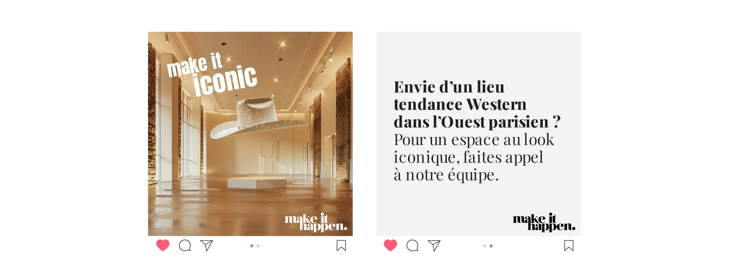Make it Happen est une agence événementielle proposant plus de 300 lieux d’exception à Paris pour des événements professionnels uniques tels que les Fashion Week. Spécialisée dans la mode, le luxe et le design, elle offre un accompagnement sur-mesure à de grandes marques françaises et internationales. De la stratégie de marque jusqu’à la communication print et digitale, Yellowblue a développé pour Make it Happen un positionnement avant-gardiste autour de la scénographie. L’ensemble des visuels de cette campagne innovante ont été créés avec les derniers outils d’IA générative.